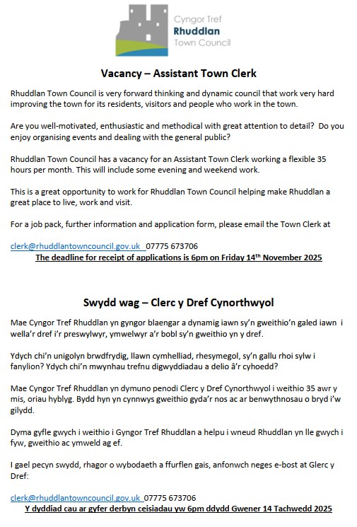 Llanfair Clydogau and Cellan Community Council – Clerk & RFO – Closing date once position filled